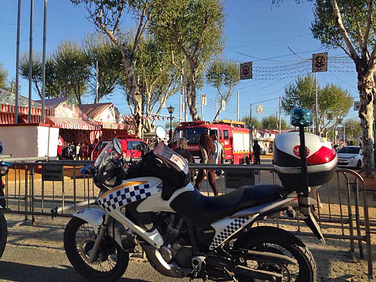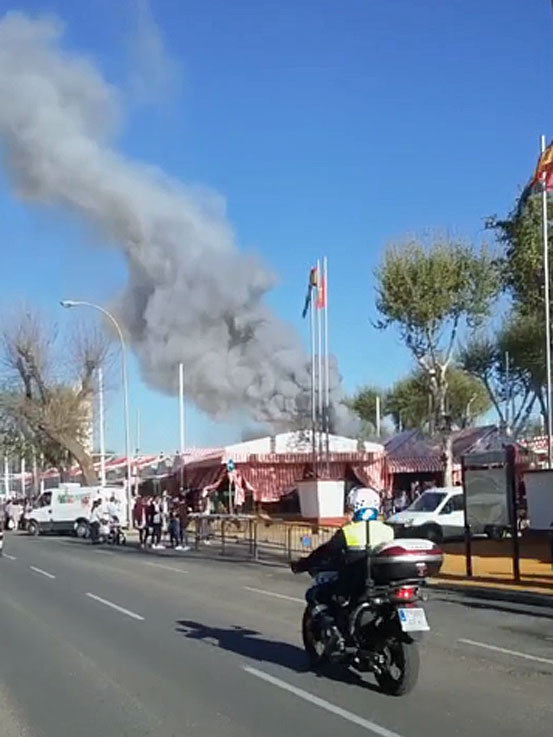 10 de Abril de 2016 Ayer sábado en la (pre)Feria de Sevilla 2016, sobre las 19 horas hubo un aparatoso incendio en la caseta situada en la calle Gitanillo de Triana 96 que acabó afectando a la caseta contigua, al número 98. Gracias a Dios no hubo que lamentar ningún herido .- Las llamas que afectaron a los toldos de ambas casetas y a los farolillos. Todo parece indicar según unas primeras estimaciones que el siniestro se originó en el sistema eléctrico de un aparato de refrigeración ubicado entre esas dos casetas.- Gracias a la pronta intervención de motoristas de policía local que avisaron a los bomberos, que llegaron de inmediato, al lugar del siniestro. El incendio congregó a multitud de curiosos por la cantidad de humo que provocó , y que se veía desde lejos.- Gracias a la rápida intervención del retén en la Feria y al material ignífugo el fuego no pasó de una desagradable anécdota de preferia, siendo tranquilizadora la capacidad de respuesta de estos profesionales que no tenemos por menos que felicitarlos y, que otros años como ha pasado en la historia de nuestra Feria los daños por este motivo hubieran sido de mayor escala ( EL MAYOR INCENDIO DE LA FERIA DE SEVILLA ).-