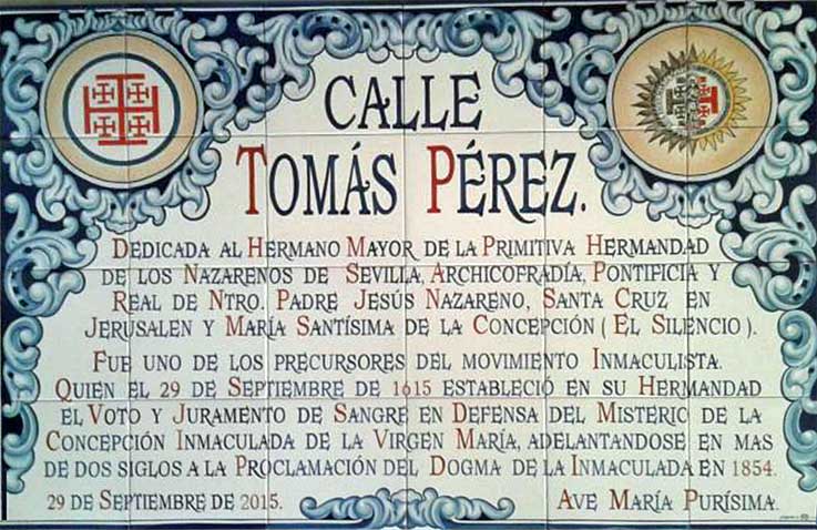 Efectivamente con motivo del cuatrocientos aniversario del voto concepcionista de la Hermandad del Silencio de Sevilla, se inauguró el pasado Septiembre un azulejo conmemorativo dedicado al que fuera Hermano Mayor de esta institución durante 40 años, don Tomás Pérez y Pérez, hermano mayor de Jesús Nazareno entre 1595-1635. Impulsor del célebre Voto de Sangre Concepcionista de 1615, ha pasado a la historia por ser uno de los promotores del Misterio de la Inmaculada Concepción en nuestra ciudad mucho antes que se proclamara por la Iglesia dogma de fe el 8 de diciembre de 1854.-
