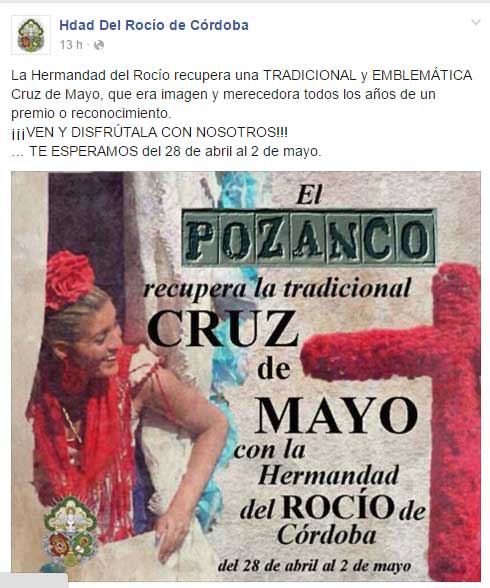 20 de Abril de 2016 Uno cuando esta montado en la barquita de la ria de la Plaza de España y se pone a navegar por las redes , por casualidad se encuentra con cosas como estas .- Como ven es un cartel de una Cruz de Mayo de la Hermandad del Rocío de Córdoba anunciado para este año , en internet y el perfíl de la mencionada Hermandad tanto de Facebook como en Twitter, como puden comprobar en estas capturas de pantallas de ayer mismo :