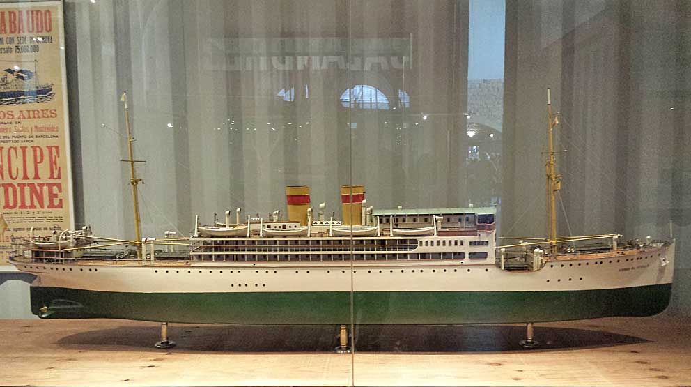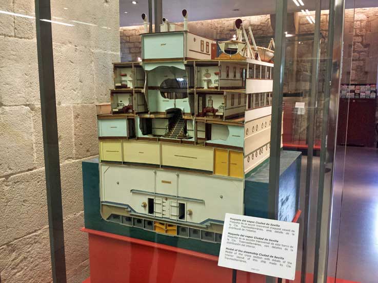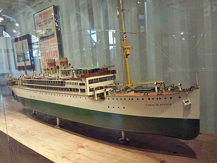 17 de Mayo de 2016 Ultimamente con tanta entrada de cruceros y barcos de guerra al puerto de Sevilla, casi tenemos una sección portuaria . D. Manuel Garcia Garcia, experto en temas maritimo, ha tenido a bien enviarno estas fotos de la maqueta del barco "Ciudad de Sevilla", que cuenta con una historia muy interesante .- La motonave “Infanta Beatriz (que así se llamaba originariamnete ) de la Compañía Trasmediterránea, que fue botado el 14 de septiembre de 1927, al servicio rápido Barcelona-Cádiz-Canarias. Las características del nuevo barco eran las siguientes: Eslora : 125 metros. Manga: 15,80 metros. Calado : 6,55 metros. Desplazamiento en máxima carga: 9.510 toneladas.Velocidad a plena carga: 16 nudos. Podía alojar 135 pasajeros de primera clase, 58 de segunda y 60 de tercera, además salón comedor sobre cubierta y cantina y hospital independientes.- En el hall estaba un artístico retrato se Su Alteza Real la Infanta Doña Beatriz, obra maestra del laureado pintor D. Juan A. Benlliure. El salón restaurante, el de fumar y el de música, así como el veranda bar, estaban muy decorados. También tenía a bordo una amplia explanada para deportes. Tenía la capilla la venerada imagen de la Virgen del Carmen, patrona de los marinos. La motonave que la Compañía Trasmediterránea aportaba al servicio de correo rápido a Canarias, con lo que se mejora notablemente la comunicación.-
