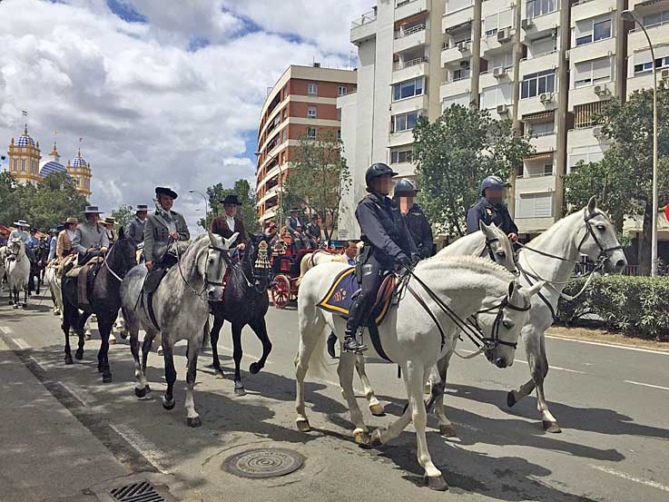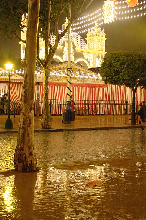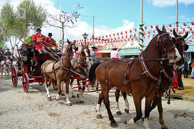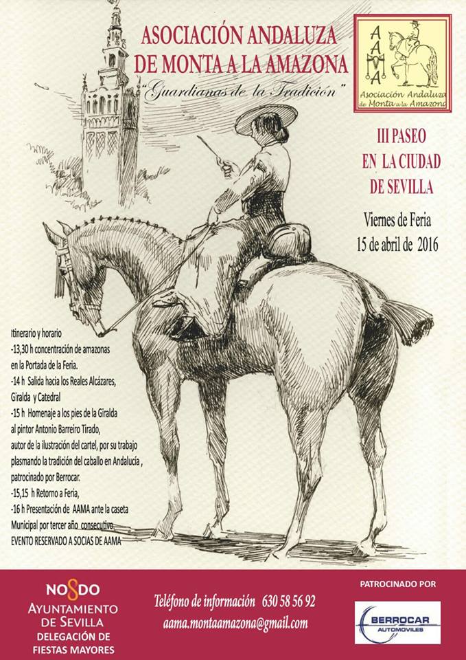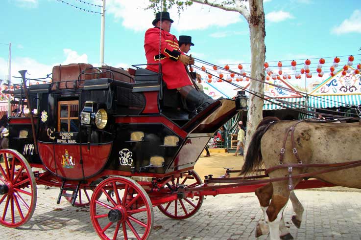 Por tercer año consecutivo las integrantes de la Asociación Andaluza de Monta de Amazona , protagonizaron un nutrido paseo por Sevilla reivindicando la clásica estampa de las amazonas Extraños carruaje, aunque sin duda valioso un MAIL COACH , coche donde además de viajar pasajeros tanto dentro de la caja ,como en el techo también lo hacia el correo y los empleados del mismo, pero mas propio del rodaje de una pelicula inglesa de época que de nuestra Feria La Feria que desde el martes no llovía , con una temperatura perfecta de 0º ( ni frio, ni calor ) , incluso se llegó a reponer parcialmente los farolillos , destrozados por las primeras lluvias, pero con los farolillos ocurre como con ciertas cruces de guía , que son un imán para el agua Tras una tarde tan primaveral como esplendorosa, y en momentos luminosa, a primeras horas de la noche vino el diluvio Un año mas la mágnifica