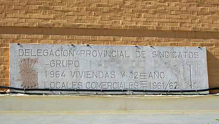 1964 viviendas franquistas y doce locales franquistas, y que ahí siguen . El texto aparece flanqueado por los emblemas del Instituto Nacional de la Vivienda y de la Delegación Provincial de Sindicatos.-