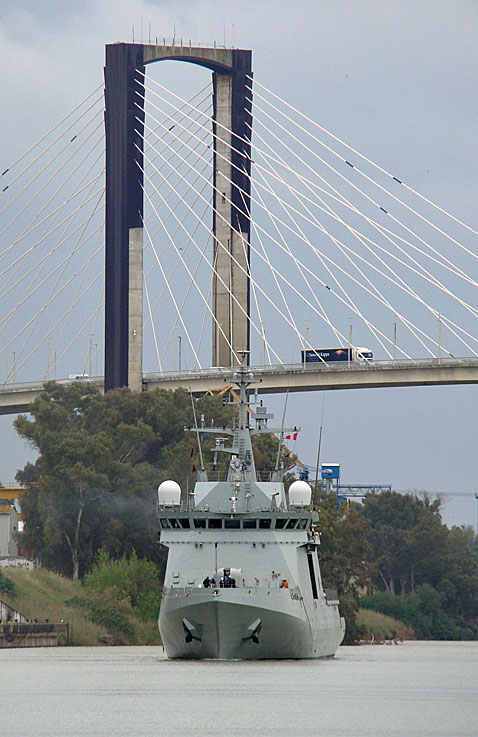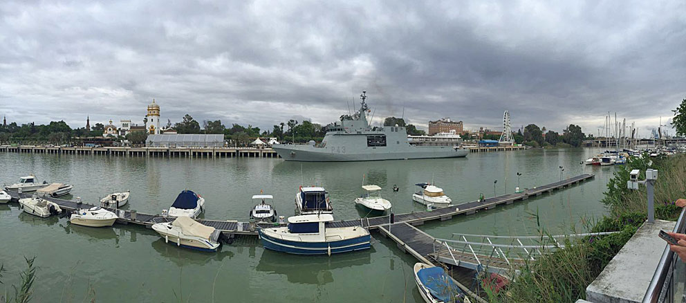 7 de Mayo de 2016 El Buque de Acción Marítima ‘Relámpago’ llegó ayer al puerto de Sevilla, muelle de Delicias, a los sones de "Ganando Barlovento". El buque de la Armada llega tras finalizar su calificación operativa en aguas de Cartagena y Cádiz en las que se ha visto sometido a un exigente programa de certificación previo a su despliegue en septiembre de este año en la “Operación Atalanta” de lucha contra la piratería en aguas del Océano Índico.- Durante su estancia en Sevilla, el ‘Relámpago’ realizará jornada de puertas abiertas en la que el público que lo desee podrá visitar el buque los días 7 y 8 en horario de 10.00 a 13.00 horas y de 15.30 a 19.30. La visita consistirá en un recorrido por diferentes compartimentos del barco, donde se explicarán las capacidades y cometidos del buque y se mostrará parte del material empleado para el cumplimiento de sus misiones. Una vez se haga a la mar, el buque comenzará su tránsito a su puerto base en Las Palmas de Gran Canaria donde continuará con sus cometidos de vigilancia y seguridad marítima que se desarrollan cada día en las aguas de soberanía e interés nacional. Características del buque El ‘Relámpago’ es el tercero de la primera serie de cuatro Buques de Acción Marítima (BAM). Está concebido como patrullero oceánico y cuenta con un alto nivel de automatismos, que le permiten ser operado por una dotación de entidad reducida. Los BAM son buques de altas prestaciones, costes de adquisición y mantenimiento reducidos y gran nivel de polivalencia, no sólo en el ámbito militar sino también en el de cooperación en tareas de salvamento, lucha contra la contaminación, evacuación y ayuda humanitaria. Son buques de construcción totalmente española según parámetros de máxima eficiencia que han demostrado su plena operatividad y polivalencia en operaciones internacionales como la “Operación Atalanta” de lucha contra la piratería .-