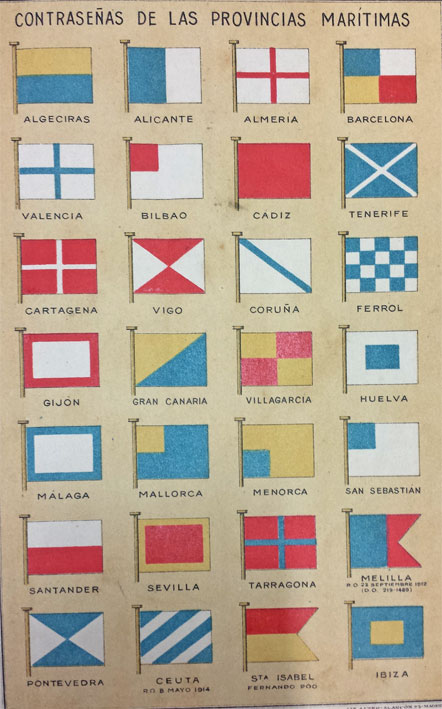 28 de Junio de 2016 Nuestro experto en barcos Don Manuel Garcia tiene la gentileza de remitirno, ahora que estamos en tiempo veraniego y marítimo, esta página de la lista oficial de buques de guerra y mercantes de 1922, donde se ven las multicolores contraseñas de las provincias marítimas de España .- Estas son las banderas de las provincias marítimas españolas. Casi siempre coinciden con la bandera de la ciudad que lleva su nombre, ya que en muchos casos, si no en todos, el origen de estas ciudades está ligado a su puerto y su vida marítima. Se dispuso que todos los buques mercantes nacionales matriculados en las distintas Provincias Marítimas de España debían largar junto con la Bandera Nacional en el tope de su palo mayor, en el pico de la cangreja u otro lugar bien visible de la arboladura, una bandera de unos determinados colores y dimensiones, como contraseña característica del correspondiente puerto de matricula.- Las provincias marítimas tienen su origen en la Real Cédula de 5 de octubre de 1607, por la que Felipe III organiza la matrícula de mar. creando las primeras provincias marítimas, . Con el trascurrir de los años, su número, ámbito geográfico, y nombre de cada provincia, han ido cambiando. Regulandose en la actualidad por el Real Decreto 638/2007, de 18 de mayo, por el que se regulan las Capitanías Marítimas y los Distritos Marítimos