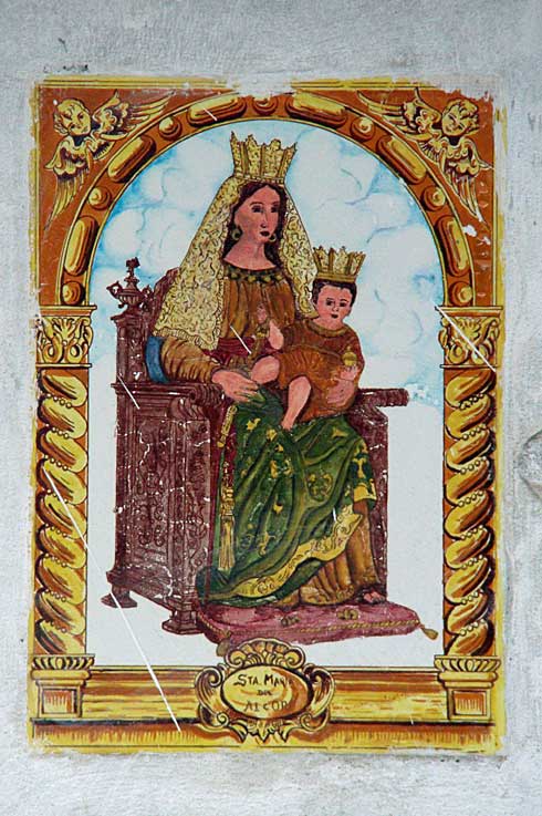 Los que tienen a bien, y sobre todo a mal seguir estas lineas, saben que un servidor entre otros muchos tontos, es el tonto del fíjate . En mi desambular por nuestra Sevilla dejada de la mano de Dios, en la fachada de una recoleta casita, creo que abandonada, me encontré con este azulejo no muy agraciado que digamos, pero que ahí está, dedicado a Santa Maria del Alcor ( Reina de los Alcores o Alcora ) ,de gran devoción de la vecina localidad en la provicnia de Sevilla, del Viso del Alcor. No, no está en Los Remedios , sino en la Avenida de Ciudad Jardín a buen seguro colocado por algún visueño o viseño, o devoto de esta Virgen .-