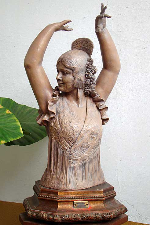 Por aquello de que estamos en plena Bienal de Flamenco de Sevilla ( se ve cada cosa ), si tiene el buen gusto de visitar Las Dueñas , ( como las demás casas señoriales de Sevilla visitables) , precisamente presidiedno el llamado salón de la gitana, hay una espectacular bailaora de bronce, obra nada mas y nada menos que de Mariano Benlliure ( el del mausoleo del Joselito el Gallo en el cementerio de San Fernando ) .-