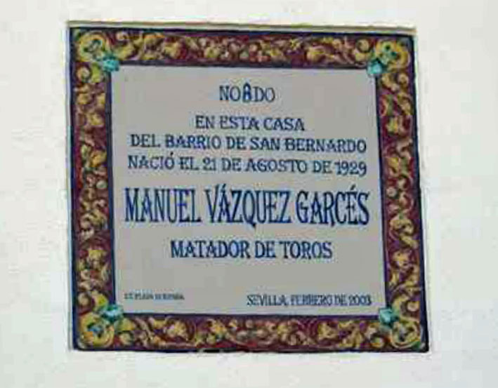 En esta casa del barrio de San Bernardo nació el 21 de agosto de 1929 Manuel Vázquez Garcés matador de toros. Sevilla,febrero 2003 Este azulejo fue realizado