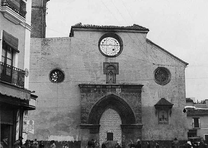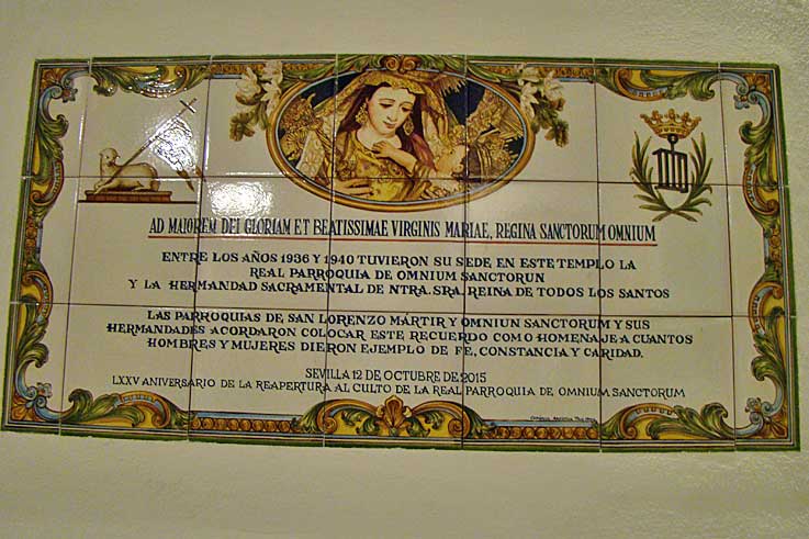 En ese azulejo no pone , que nuestros amigos los rojos en una alarde democrático les dio por pegarle fuego dos veces a Omnium Sanctorum , una en 1931 y otra la famosa noche del 18 de Julio de 1936, ( ver foto superior ) para contener el Alzamiento Nacional y cuto templo como el Ave Fénix ( tranquilo que no aparece en el escudo de España ) ,renació de sus cenizas.-