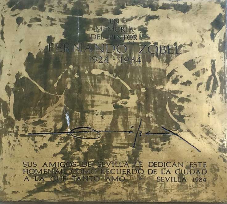 columna queda inmovilizado durante algún tiempo.MEMORIA DEL PINTOR FERNANDO ZOBEL 1924 1984 ( FIRMA ) SUS AMIGOS DE SEVILLA LE DEDICAN ESTE HOMENAJE COMO RECUERDO DE LA CIUDAD A LA QUE TANTO AMO SEVILLA 1984 Su primera exposición tuvo lugar en Boston en 1951 A partir de los años sesenta del siglo XX comienza una evolución como pintor abstracto, desarrollando un estilo característico, en el que sin duda la caligrafía china representa uno de los influjos más evidentes. En 1966 funda el Museo de Arte Abstracto Español, en las Casas Colgadas, el lugar más emblemático de Cuenca, colaborando en el diseño de este museo, los pintores Gerardo Rueda, Gustavo Torner, Manuel Millares, Antonio Lorenzo, Sempere, Antonio Saura, Martin Chirino, Bonifacio Alfonso, Luis Feito, etc.-