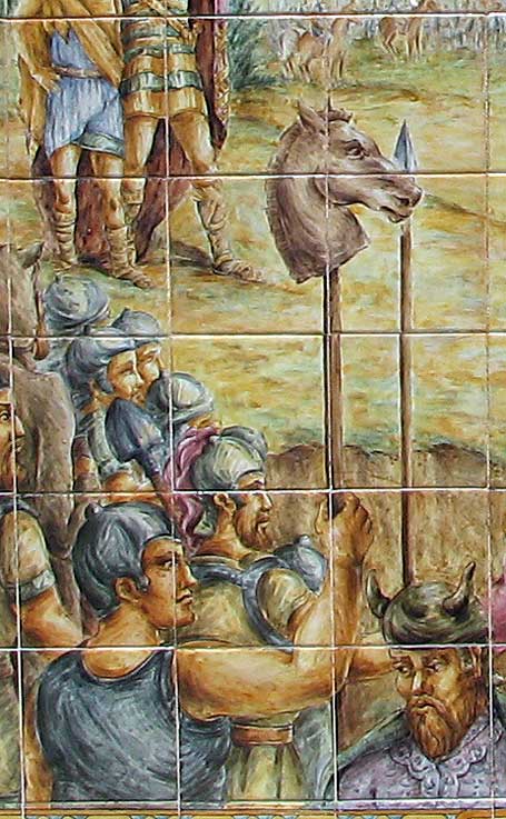 Curiosa representación cruel hacia un caballo en una ciudad como Sevilla , en este azulejo de la Plaza de España ( donde siempre hay cosas por descubriri ) que representa la llegada del general cartaginés Almicar ( el papa del que fuera mítcio Anibal ) , fundando Acra Leuca ( que luego sería Alicante ) que realemnte era una base militar cartaginesa, para lamerse la heridas , despues de los romanos le hubiera partido bien la boca en la primera Guerra Púnica .-