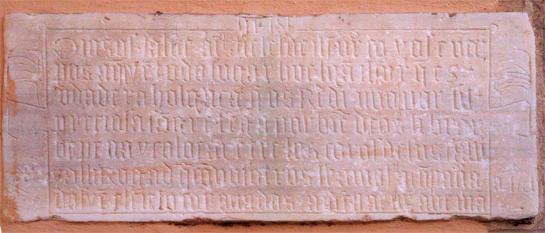 Alli podemos apreciar, como les decía, una placa de mármol con una inscripción en caracteres góticos, donde se puede leer lo siguiente: