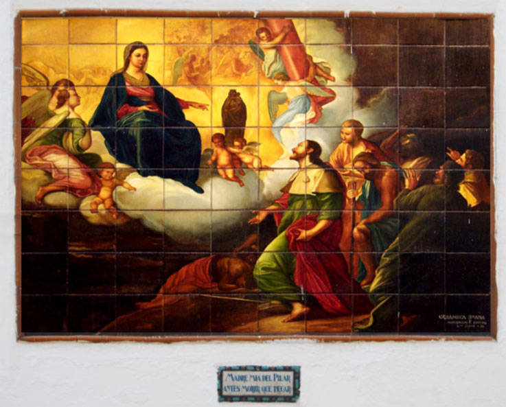 En uno de los retablo cerámico compuesto por ochenta piezas de azulejo pintado a mano donde se representa la escena en la que la Virgen del Pilar se aparece a Santiago Apóstol. Tiene unas medidas aproximadas de1,50 x 1,15 m. Le acompaña un panel cerámico en la parte baja tiene una curiosa leyenda un poco drástica :