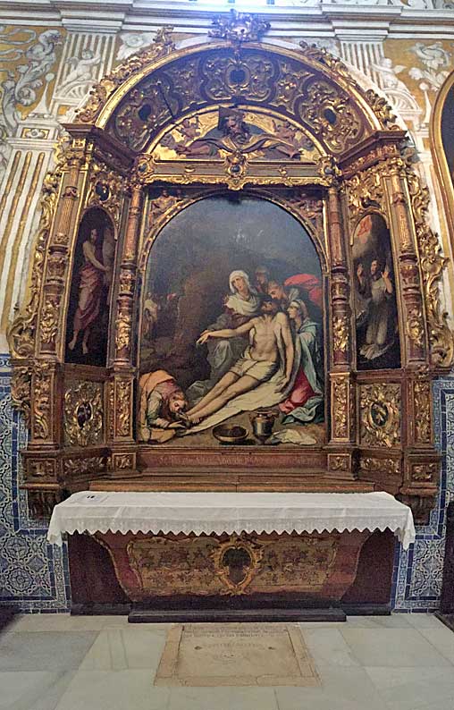 Hoy llegamos a la siempre impresionante Iglesia Santa María la Blanca de Sevilla Nave del Evangelio. Retablo de la Piedad, donde nos encontramos con este enterramiento reanacentista , cuyo finado financio todo el retablo bajo el que se encuentra .