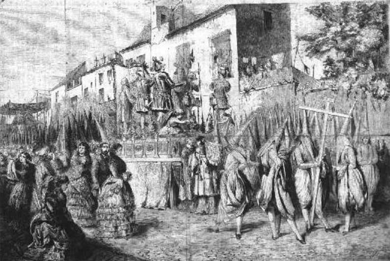 1 de Marzo de 2017 Como le comenté el mes pasado, este año tengo el proposito de traer grabados de temas sevillanos , en una época que no había camaritas digitales ni tontos del palito . Por aquello de que hoy es Miércoles de Ceniza , y estamos a cuarenta dias de la que la primera este en la Campana ( lo que cada año es un milagro ), y con el sincero deseo de que Dios confunda a los cristianófobos que muestran su inmundicia; hoy les traigo este grabado frances del 1841 , bajo el título Cofradia del Silencio de Sevilla .- Está bien puesto el título, porque realmente en primer termino tenemos el Misterio Nuestro Padre Jesús del Silencio en el desprecio de Herodes, de ahí lo de Silencio , de que que pudiera ( o pudiese ) confundirse como es conocida la Madre y Maestra . Al fondo de se ve el palio de la Amagura , asi como unos nazarenos de una Sevilla de estilo romántico , asi como la indumentarias de las señoras que contemplan la procesión .- Este pasos de Misterio de la Hermandad de la Amargura , concretamente un paso de estilo neoclásivo , exhornado con profusas columnas corintias que adquirio ese mismo años de 1841, obra de Manuel Rodriguez Espinosa , que fue usado hasta 1910 . Sobre unas mensulas figuraban en él dos interesantes angeles mancebos obra de Benito Hita del Castillo de 1763 .- Este primitivo misterio desaparecia en el democrático y legítimo incendio que le pegaron los rojos en 1936 .-