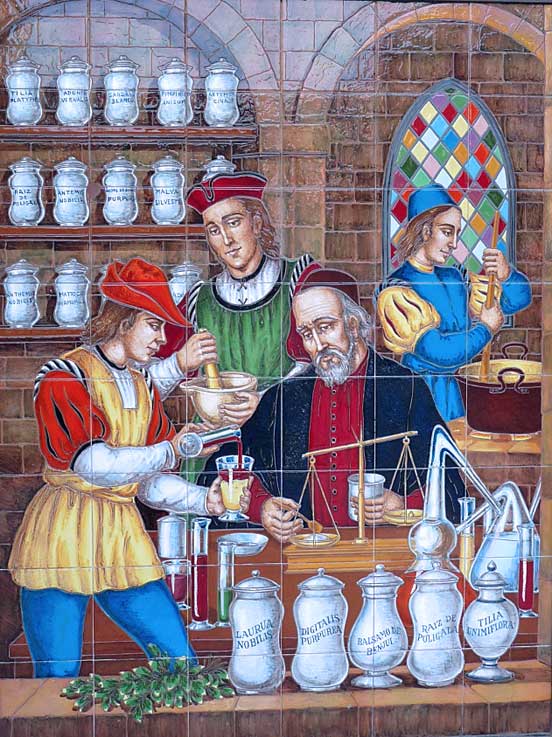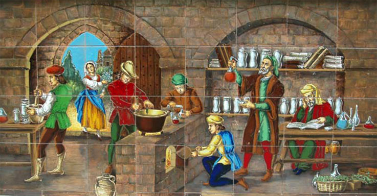 de azulejos que recrean escenas de boticas mediavales , como las que vemos