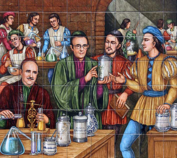 Sin salir del barrio de Triana en Sevilla, en la calle San Jacinto nos encontramos con esta bella farmacia con dos lienzos cerámicos modernos donde posiblemente su propietario , colaboradores ( llamados "mancebos" en su día ) , familiares, amigos, deudos o afectos aparecen inmortalizados como boticarios mediavales entre botes y plantas medicionales