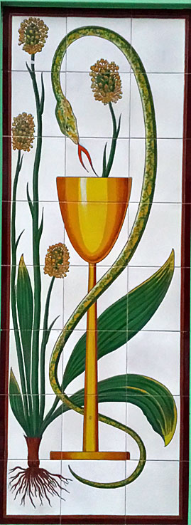 Los dos primeros que aqui vemos corresponden a la farmacia en la Avda. de Miraflores,esquina Rosaleda. Aquí no hay escena de botica antigua sino en uno de ellos el emblema de los farmaceuticos la Copa de Hígia es internacionalmente uno de los símbolos más conocidos de la profesión farmacéutica. Se trata de una serpiente enroscada sobre una copa o cáliz. El símbolo tiene su origen en la diosa griega Higía, hija del dios de la medicina Esculapio y hermana de Panacea, la diosa de la curación. Higia , la diosa de la salud y de la higiene ( origen etimológico ) , recibió de su padre el encargo de preparar los remedios que él empleaba. La copa es el receptáculo adecuado y condigno del poder curador, y contiene drogas potencialmente activas.La serpiente sagrada es la que va a infundirle la dynamis, la virtus que transforma la posis (bebida) en pharmakon (el medicamento ).-