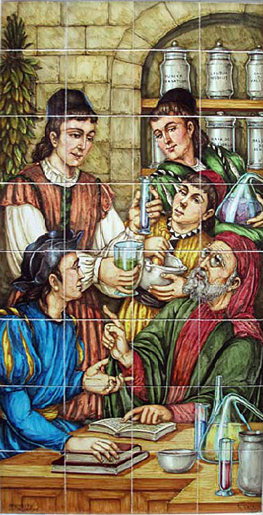 Como continuación a nuestra entrega Boticas cerámicas (2) , les traigo estos tres primeros lienzos cerámicos que fueron diseñados por Álvaro Satué Sanz, y creados por Antonio Caro Parra .-