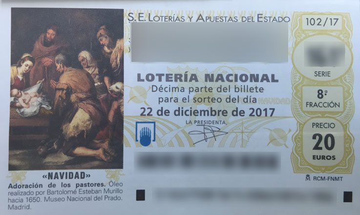 19 de Julio de 2017 A mi no me miren estamos en Julio en Sevilla a mas de 40ºC, y si se acerca a una Admo de Loteria, ya hay Loteria de Nacional de Navidad ( si, esa misma que compran los catalanes y vascos de la cuerda renegada separatista ) , por aquello del "Mira que si cae aquí", pues aún no nos hemos ido a la playa cuando ya empezamos con la loteria navideña, para que después critiquen a los capillitas de "jartibles".- Por aquello que estamos en el año de Murillo pues la obra que ilumina el décimo es como reza en el mismo : Adoración de los pastores oleo realizado por nuestro Bartolomé Esteban Murillo realizado hacia 1650 y está colgado en el Museo del Prado .- Efectivamente este cuadro
