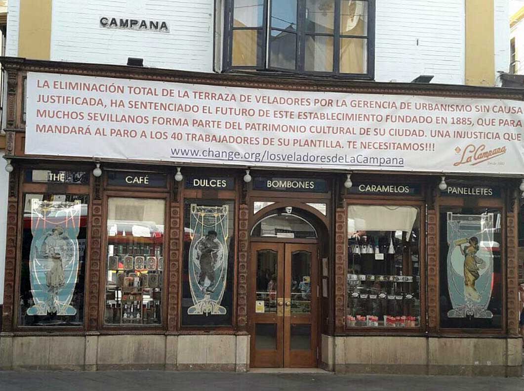 16 de Julio de 2017 Ha aparecido esta pancarta en la confiteria La Campana ( sin duda toda una institución en Sevilla ) y como he puesto en mis rede sociales , a parte de que cada uno es muy dueño de pioner en su casa lo que quiera , quizás le sobra el último párrafo . Pues si el éxito o fracaso de este negocio desde 1885 solo depende de un puñado de veladores es que hemos estamo mal informado durante 132 años . Conozco restaurantes y bares en nuestra ciudad, con décadas de existosa y nunca han tenido uno solo velador en la puerta .- El victimismo, apelar al buenismo tan de moda en el siglo XXI , puede crearnos una situación de espejismo respecto a la triste realidad que padecemos en TODA Sevilla, convertida en un gigantesco chirringuito, pestilente, ruidoso, descontrolado e impune por parte de nuestros Ayuntamiento del presente y pasado en un suma y sigue que no tiene fin . Miren paso a darle datos frios y objetivos .- La estadísticas 2010-2016,
