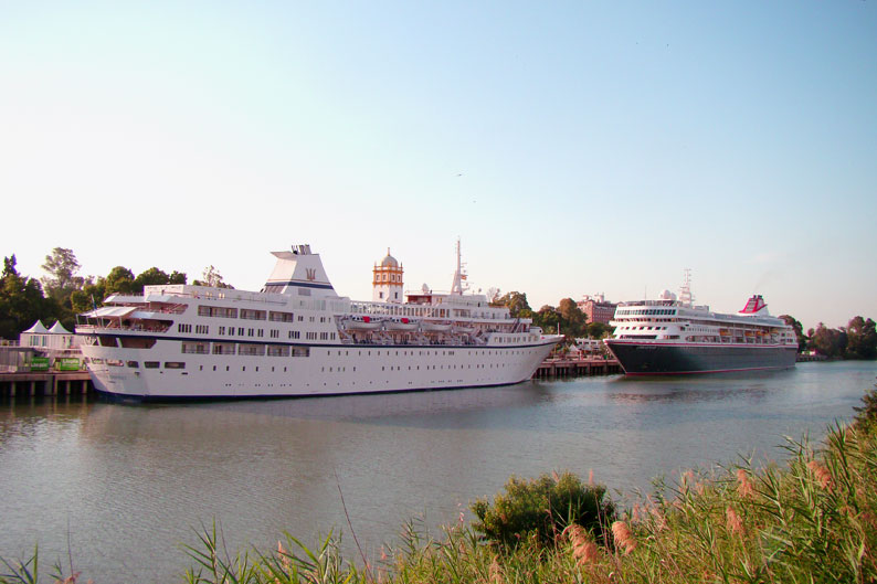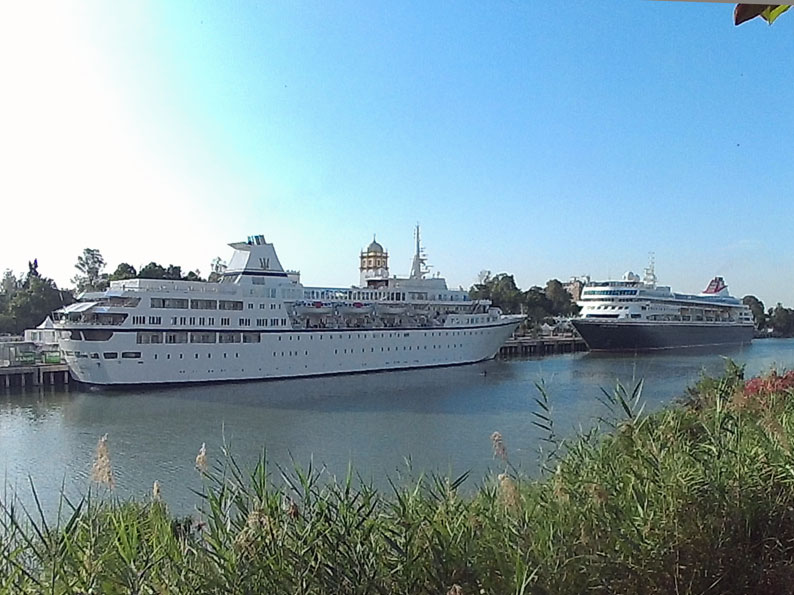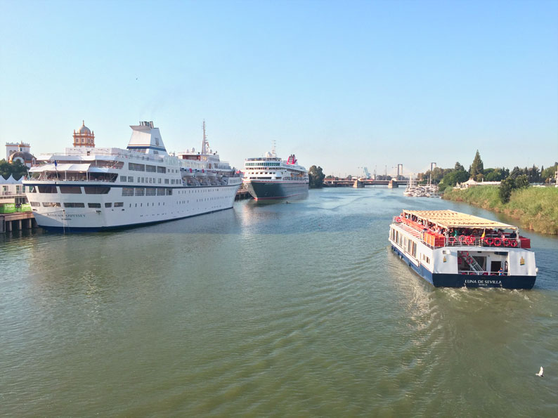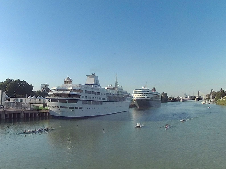 18 de Junio de 2017 Aunque ya es frecuente la visitas reiteradas de cruceros, ayer coincidian en el Muelles de las Delicias de Sevilla el crucero Aegean Odyssey , y el Braemar , dejándonos esta imagen tan marinera y refrescante en estos dias de verano adelantado , mas asfixiantes que calurosos . Como siempre les comento Sevilla no tiene costa pero si tiene puerto, al ser el Guadalquivir navegable hasta Sevilla .- Viendo estas imágenes se plantea uno, para cuando nos vamos a dejar de ecologismo radical y se va a realizar de una vez el mas que necesario dragado del rio para que puendan entrar esos grandes cruceros modelo bloques de pisos de varias plantas como se ven en los puertos de otras capitales europeas . no olvidemos que alguien que se baje de uno de estos barcos que ven en la foto, solo cruzando la acera están dentro del parque de Maria Luisa y la Plaza de España , y a escasos minutos ( con otras temperaturas ) puede ir perfectamente andando a la Catedral, Giralda y Alcazar , donde atracan practicamente en el casco historico de nuestra ciudad .- |