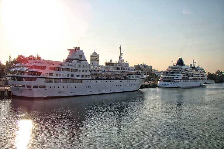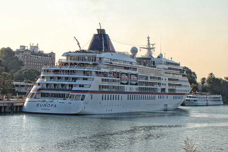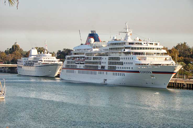 1 de Noviembre de 2017 Aunque ya es frecuente la visitas reiteradas de cruceros, ayer coincidian en el Muelles de las Delicias de Sevilla el crucero Aegean Odyssey , y el Europa , dejándonos esta imagen marineras . Como siempre les comento Sevilla no tiene costa pero si tiene puerto, al ser el Guadalquivir navegable hasta Sevilla .- Viendo estas imágenes se plantea uno, para cuando nos vamos a dejar de ecologismo radical y se va a realizar de una vez el mas que necesario dragado del rio para que puendan entrar esos grandes cruceros modelo bloques de pisos de varias plantas como se ven en los puertos de otras capitales europeas . No olvidemos que alguien que se baje de uno de estos barcos que ven en la foto, solo cruzando la acera están dentro del parque de Maria Luisa y la Plaza de España , y a escasos minutos ( puede ir perfectamente andando a la Catedral, Giralda y Alcazar , donde atracan practicamente en el casco histórico de nuestra ciudad .- |