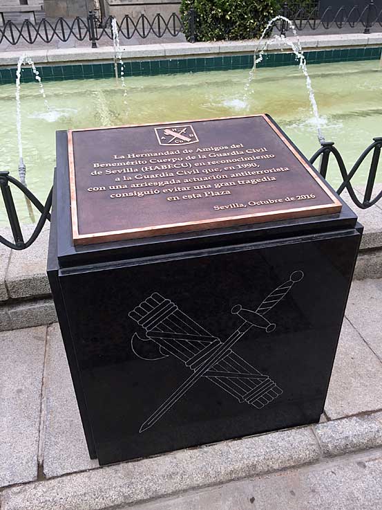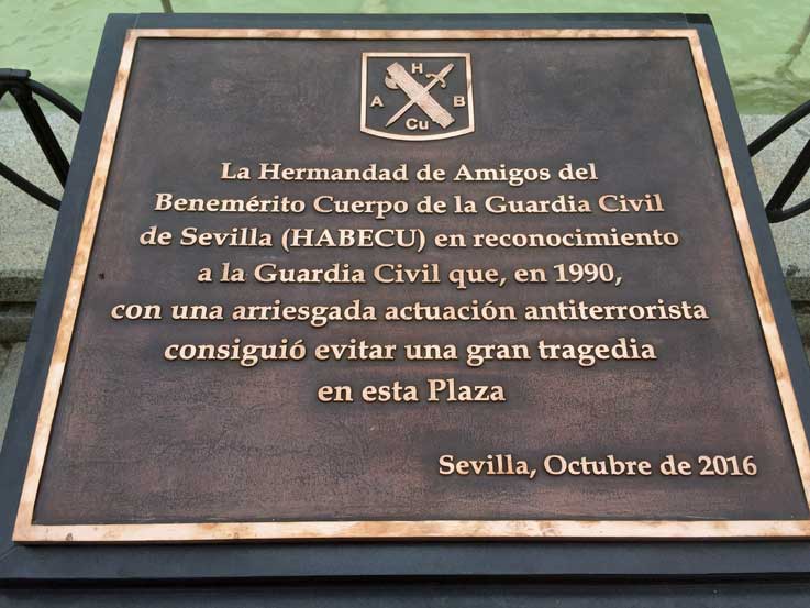 Lo que no dice en esa placa es que el 2 de Abril de 1990 el cabo primero José María Infante Borrero en un control rutinario de la Guardia Civil llevo a cabo la detención del etarra Henri Parot, que se saltó el control y luego la emprendió a tiros con él y su compañero Adolfo Domínguez, un etarra miembro del Comando Argalaque que habia perpetrado 22 atentados en el que murieron asesinadas 38 personas y más de 200 resultaron heridas -