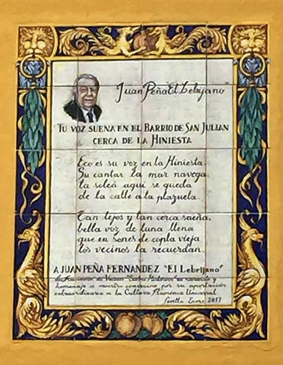 En la calle San Hermenegildo de Sevilla nos encontramos con este azulejo dedicado a El Lebrijano :