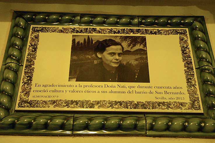 Quince años después de su muerte, a doña Nati, la Asociación Amigos de los Jardines de la Oliva y un nutrido grupo del vecindario han dedicado a la docente este azulejo en el barrio de San Bernardo en la calle Santo Rey :