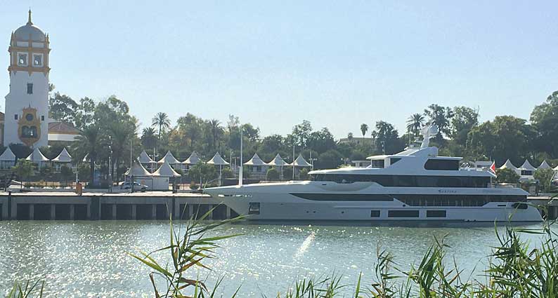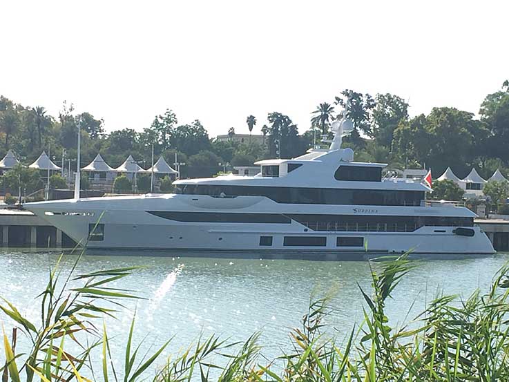 12 de Agosto de 2017 Ayer estuvo anclando en el Muelle de la Delicias de Sevilla el lujoso yate Surpina de unas lineas elegantes y modernas .- El yate "Surpina" construido por Benetti en Italia en su astillero de Livorno, fue entregado a su propietario en 2015. Su elegante estilo exterior e interior es el trabajo de Benetti, quien también es responsable de su ingeniería .- Surpina ofrece alojamiento para hasta 16 personas 2 cabinas de propietario, 6 cabinas dobles .Cuenta con gimnasio, piscina y aire acondiconado Bandera de Malta . Eslora 56 m . Manga 10 m . Calado 3,1 m . Velocidad de crucero 12 nudos y máxima de 16 nudos . Tonelaje bruto 950 toneladas .-