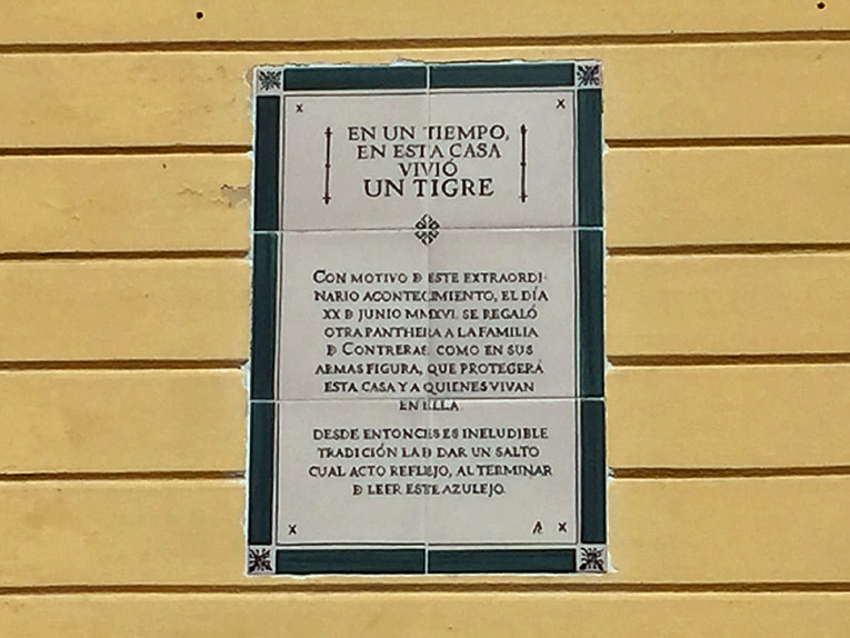 Lo de la pantera no lo se, porque nunca lo vi, pero aquella visión del tigre como dicen los notarios, doy fe, y siempre me acompaño el resto de mi vida, cada vez que he pasado por aquella zona . Hoy este azulejo la corrobora .Curiosidades y misterios de Sevilla .-