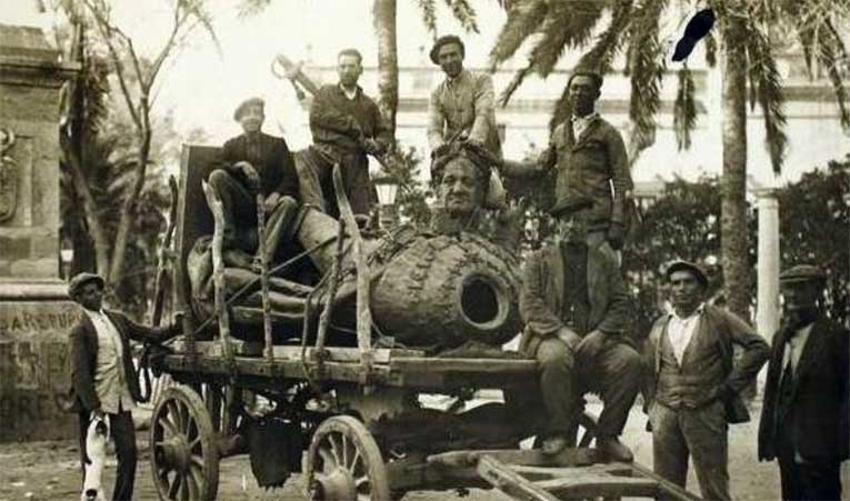 triunfantes y sonrientes , llevan en un carro una mutilada estatua de Fernando