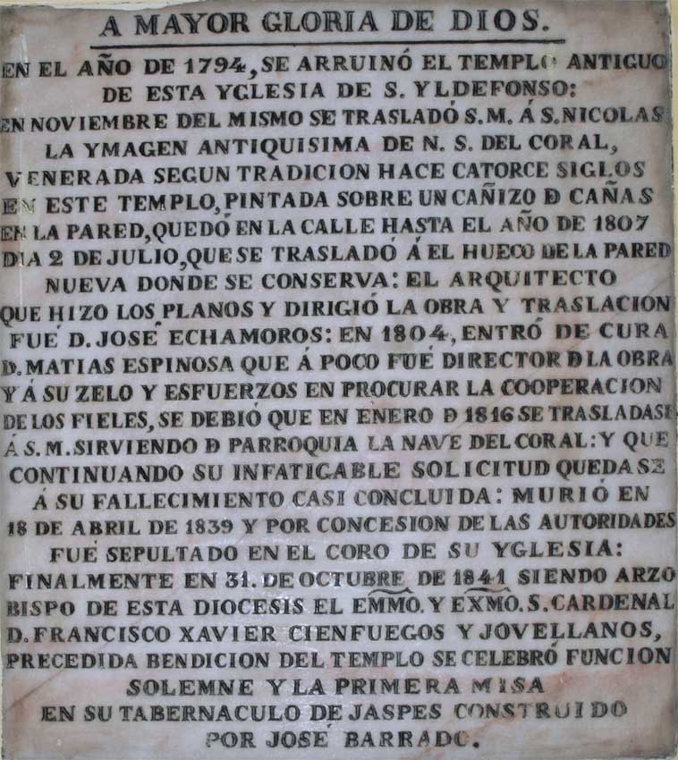 Efecticamente como casí reza en la documentada lápida , el 21 de enero , tal dia como hoy , pero de 1816 se trasladó con toda solemnidad al Santísmo . desde la Iglesia de San Nicolás hasta la nave de la Epístola del nuevo templo de San Ildefonso sirviendo de parroquia la nave del Coral , donde quedaría instalada hasta la conclusión de las obras.-