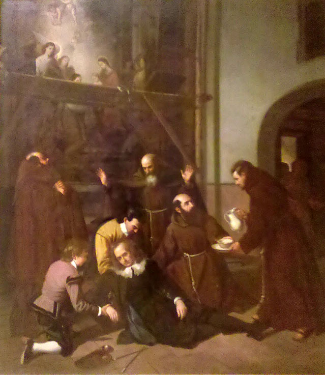 1 de Marzo de 2018 Por aquello de que seguimos en el año murillesco, hoy les traigo este curioso cuadro de un gran pintor sevillano que plasmó la caida de Murillo , la cual tuvo un fatal desenlace .- Murillo murió en 1682, meses después de sufrir una caída desde un andamio cuando pintaba el retablo mayor del convento de los capuchinos en Cádiz, una escena que 200 años más tarde inmortalizó el sevillano Manuel Cabral Aguado Bejarano, el pintor de la calle Génova .- La obra del sevillano Manuel Cabral Aguado Bejarano (1827-1891) fue realizada para participar en un concurso que en 1891 convocó la Academia de Bellas Artes de Cádiz para conmemorar la fatal caída de Murillo cuando pintaba el lienzo central del retablo mayor de la iglesia del convento de los capuchinos de Cádiz. Según explica el historiador Lorenzo Alonso de la Sierra, aunque hoy en día se piensa que aquella fatal caída ocurrió en el estudio sevillano de Murillo, la tradición prefería situarla en la misma iglesia, y así quiso reflejarlo en su obra el pintor sevillano. - Apenas cultivó el género histórico, lo que da un especial valor a la obra "La caída mortal de Murillo", una obra en la que recrea el momento en el que el pintor es asistido por los frailes, tras caer cuando se procedía a izar el lienzo "Los Desposorios de Santa Catalina" al retablo mayor del templo conventual capuchino. El cuadro, que estaba en los almacenes del Museo de Cádiz desde su fundación, en la segunda mitad del siglo XIX, sufría un gran deterioro, del que se ha recuperado para exhibirse en la sala "El pleno barroco. Murillo".- |