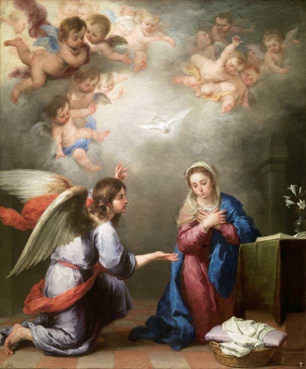 2 de Marzo de 2018 Por aquello de que estamos en Cuaresma y en el Año de Murillo, hoy les traigo una primera entrega de un pequeño juego de la presencia de cuadros de Murillo en los pasos de la Semana Santa de Sevilla que en su dia fueron inspiración de orfebres, bordadores , etc .- La mecánica de este juego es mas simple que el mecanismo de un búcarro, arriba les dejo el cuadro original , bajo él cual están rerepresentado cofradieramente usted tiene que adivinar en que lugar y que Hermandades son . Las respuestas están al final . No hagan trampas .- Primer cuadro La mal denominada Anunciación ( porque relamente representa el Misterio de la Encarnación ) obra de Murillo de 1660 , adquirida por Isabel de Farnesio ( aquimiseñora de Felipe V , posiblemente en su estancia en Sevilla, cuando nuestra ciudad fue Villa y Corte ) y hoy se encuentra en el Museo del Prado de Madrid