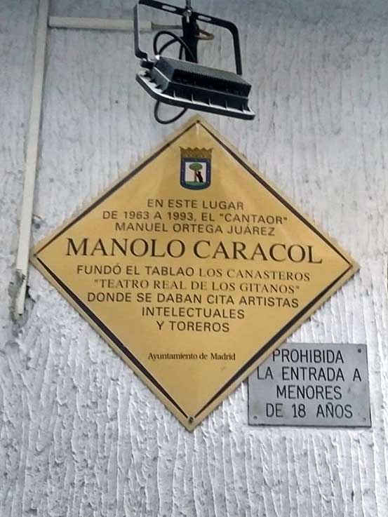 DE 1963 A 1993 EL "CANTAOR" MANUEL ORTEGA JUAREZ MANOLO CARACOL FUNDÓ EL TABLAO LOS CANASTEROS "TEATRO REAL DE LO GITANOS" DONDE SE DABNA CITA ARTISTAS INTELECTUALES Y TOREROS Ayuntamiento de Madrid En 1963 funda en esta Calle