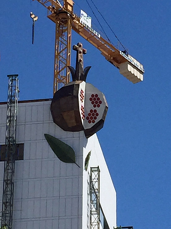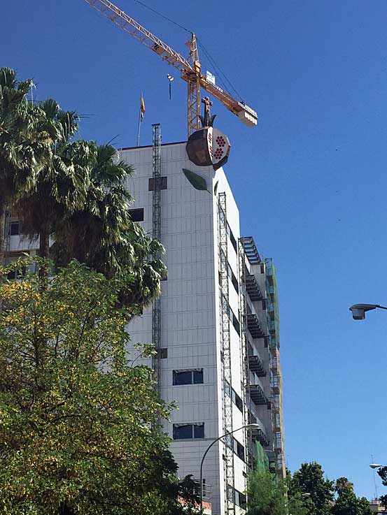 7 de Julio de 2017 Si pasan por la avenida de Eduardo Dato a la altura del Hospital de San Juan de Dios o por la calle colindante veran que en la ampliación del hospital acaban de colocar en una de sus esquinas lo que a primera vista parece una granada gigante de proporciones importantes, que sin duda acabará siendo un referente urbano - Para no caer en innecesaria reiteraciones, aqui les dejo la explicación de esto, cuando les hablé del Callejón de los faisanes de Sevilla , pues se trata de la heráldica de la orden Hospitalaria de San Juan de Dios .- |
