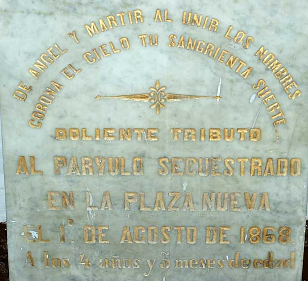 "Deteniendo á un niño de cinco años amenazando por cartas á su madre y á otra persona con matarle si no se entrega una cantidad determinada y matándole por último se incurre en la delincuencia compuesta del art 516 núm 1 o del Código ó se cometen los tres delitos de detencion ilegal de amenazas con condicion ilícita y de homicidio En Agosto de 1868 ocurrió en Sevilla un suceso que alarmó vivamente los ánimos De la concurrida Plaza Nueva fué sacado una noche y detenido en sitio oculto de las afueras de la ciudad un niño de cinco años Su madre y otra persona recibieron por escrito la amenaza de que le matarian si no se llevaba cierta cantidad á tal ó cual punto Despues de algunos dias se le dió la muerte ...................................................................................................................................................................................................................................................................................... ............ considerando de la sentencia se dice que Morillas y Madrigal pusieron de acuerdo para robar á terceras personas ó deteniendo hijos de éstas y exigiendo por su rescate con amenazas de muerte las cantidades que desearan obtener La equivalencia de sustraccion y detencion que aquí se establece y cuya idea se repite en el segundo considerando es contraria al penal Los procesados no se propusieron sustraer sino detener arrebatar niños á sus padres definitivamente sino encerrarlos dirigir amenazas de muerte para exigir dinero en la forma apremiante ................................................................................................................................................................................................................................................ .................................................. Morillas se llevó el niño al Tagarete consumó una detencion sin ningun elemento de robo Morillas dirigió amenazas de muerte del niño por escrito y con exigencia dinero á su madre y á otra persona y cometió el delito Morillas causó por último una alevosa y premeditada muerte .-" A finales de Agosto de 1869 Francisco Morillas era condenado y ejecutado, y Jose Mayoral condenado a cadena perpetua por el secuestro y muerte del desdichado niño Antonio Aznar .- A finales del siglo XIX las leyes y la Justicia eran más rápidas y eficaces, hoy estos dos individuos posiblemente se estarian paseando por la calle, tras un no muy dilatado periodo de tiempo en la cárcel .- |
