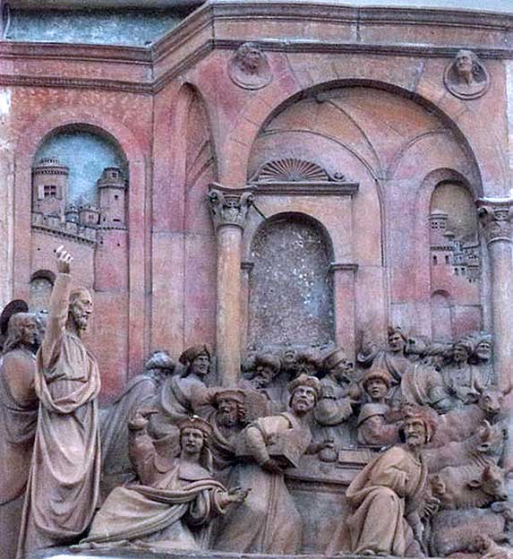Jesús expulsando a los mercaderes del templo . Relieve de la Puerta del Perdón de la Catedral de Sevilla |