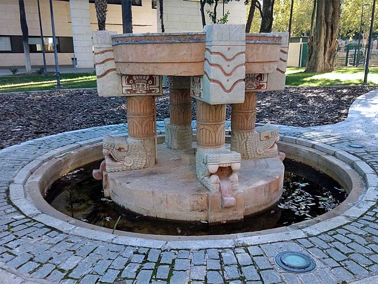 26 de Junio de 2019 Por si han paseado entre la trasera del Pabellón de Méjico de la Exposición Iberoamericana de Sevilla de 1929, y donde esta el horrible edificio de la biblioteca Rector Antonio Machado ( no confundir con el poeta sevillano ), mamotreto que chirría en ese conjunto monumental del pabellón antes mencionado , la trasera del Museo Arqueológico, que se cae a pedazos dejado de la mano de Dios, y el cuartel de la Benemerita de Eritaña ( en la época de la Exposición Hotel Eritaña , que no se llegó a inaugurarse ) , verán que allí colocarón y sigue estando esta fuente maya tolteca .- Hoy volvemos a abrir nuestra sección Sevilla(nos) por el mundo donde encontramos réplicas de monumentos, esculturas, fuentes, etc de los que están en Sevilla , repartidos por el mundo mundial por los motivos mas variopintos y multicolores . Pues hoy es uno de esos casos .-