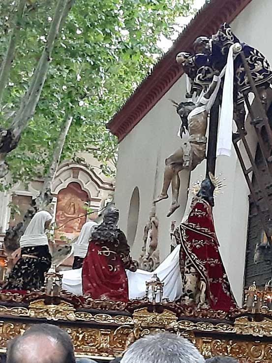 19 de Abril de 2019 El Jueves Santo en Sevilla se partió por la mitad . Una tremenda tormenta de granizo, hasta tal punto que parecía que había nevado en Sevilla en pleno mes de Abril .- Logicamente con ese panorama, Las Cigarreras , Los Negritos, Los Caballos de Santa Catalina y Montesión decidieron no hacer estación de penitencia . Horas más tarde tras la tempestad vino la calma, y salieron la Quinta Angustia, El Valle y Pasión .-