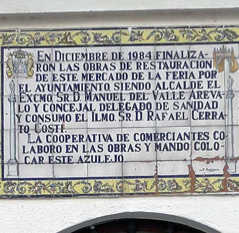 Continuando con la historia lapidaria y cerámica del Mercado de calle Feria, nos encontramos ya en el edificio del mercado con estos dos azulejos . Aclaración la foto superior no es que esté desenfocada, sino es la mierda acumulada de años que tiene el cristal que lo cubre ( que sigo yo que porque alguine le diera con una bayeta mojada no pasaría nada ) . Cuyo texto es el siguiente :