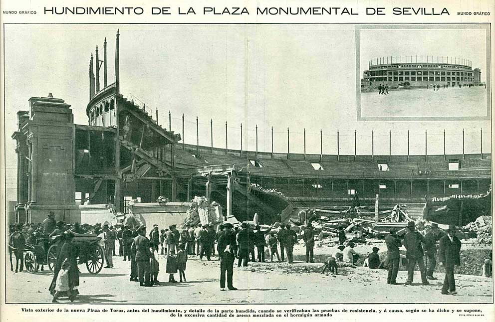 10 de Abril de 2019 El empresario sevillano José Julio Lissén Hidalgo ideó un proyecto faraónico para competir con la Maestranza con un aforo superior y unos precios populares con el apoyo implícito de su amigo José Gómez Ortega -Joselito el Gallo- que encontraba en la cima de su carrera .- El arquitecto vasco Francisco de Urcola Lazcanotegui , con antecedentes en edificios taurinos como la desaparecida Plaza de Toros de San Sebastián (1903), proyectó en 1915 el coso de la Monumental de Sevilla ( situado Av Eduardo Dato equina Av Buhaira aproximadamente ) con un corte neoclásico y contó con la colaboración en la dirección de obras de José Espiau y Muñoz.- En su construcción se experimentó con un materila novedoso para la época como el hormigón armado, siendo la primera vez que se usaba en una plaza de toros, pero la cosa tuvo su mala sombra . ya que sufrió dos hundimientos, uno durante la ejecución eel 13 de Diciembre de 1916, y otro durante las pruebas de carga efectuadas tal dia como hoy el 10 de Abril de 1917. donde la prueba de resistencia de 500 kilogramos por metro cuadrado colocada provocó al poco tiempo las primeras fisuras y se vino abajo un tercio de su graderío, por lo que el arquitecto enfermó .- Superadas las adversidades técnicas el edificio fue sometido a una prueba de carga satisfactoria en 1918, que ofreció las oportunas garantías para autorizar su inauguración el 6 de junio de 1918.- En 1921 el gobernador decretó el cierre del edificio por supuestos problemas estructurales, siendo demolido en 1930 tras casi una década de olvido.- Curiosamente la plaza de Pamplona, edificada sobre los planos que había trazado en 1915 el arquitecto bilbaíno Francisco Urcola Lazcanotegui, para la que fue efímera segunda plaza de toros de Sevilla .- |