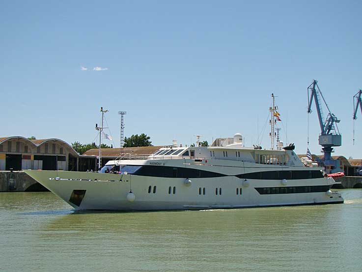 19 de Mayo de 2019 Ayer llegó al muelle de las Delicias el Mega Yate Crucero MY Harmony V, botado el 2009 y renovado en el 2017, con bandera de Grecia . Con 55 metros de eslora , por 8, 3 de manga y 3 metros de calado . Puede alcanzar una velocidad de 10 nudos . Con una capacidad para 40 pasajeros distribuidos en 25 cabinas y una tripulación de 18 personas .-. |