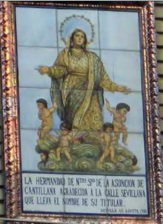 Este azulejo fue donado a la ciudad por la Hermandad de Ntra. Sra. de la Asunción de Cantillana para ser colocado en la calle que lleva por nombre la advocación de su Titular. Fue descubierto el 15 de agosto de 1985, día de la festividad de la Asunción de la Virgen.-