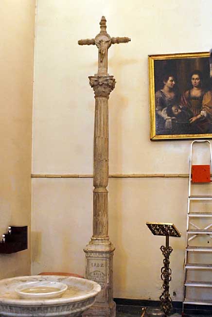 Hagamos un poco de historia . En 1582, este espacio era utilizado como cementerio, fecha en la que se coloca una cruz de piedra sobre columna para honrar a los enterramientos realizados a raíz de una gran epidemia , por esta razón era conocida como plaza de la Cruz de San Vicente; en 1839 fue retirada la cruz original , que se conserva en el interior de la parroquia ( foto superior ) , aunque se repondría más adelante. por una réplica ( foto inferior ) .-