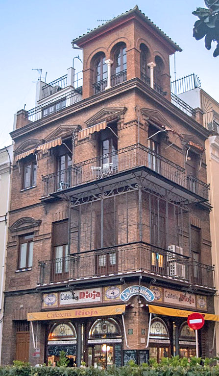 Está colocado exactamente en uno de los laterales de la Cafeteria - Bar Rioja , en este impresionante edificio regionalistas, con todos sus habios: ladrillos visto, ceramica , cierro y hasta un hermoso mirador de dos huecos; que tampoco está mal situado en la esquina de la calle Jesús del Gran Poder número 4 , con la radiofónica ( donde nació "La Voz del Guadalquivir" ) calle Aponte, que tampoco es mal sitio .-