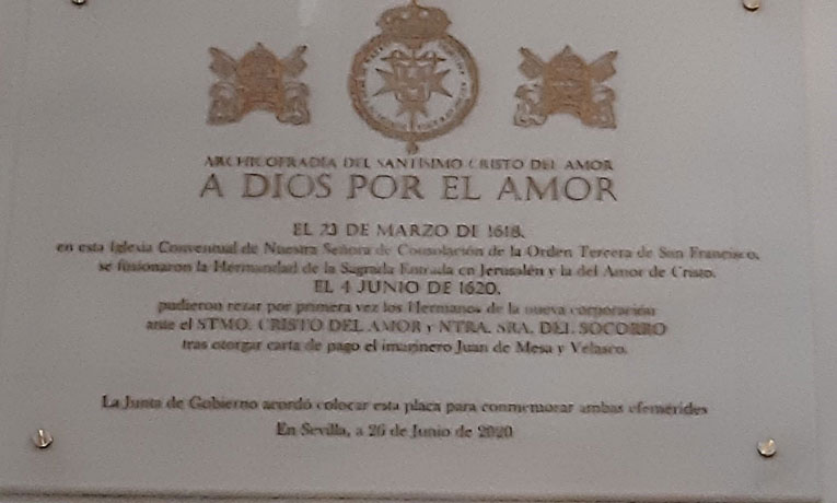 Desde el pasado viernes la Iglesiade los Terceros de Sevilla cuenta con una nueva placa conmemorativa , en este caso de una doble efemerides , la fusión de La Hdad de la Borriquita , con la Hdad del Amor, y por otro lado la entrega por Juan de Mesa del Crsito del Amor a la Hermandad . En la misma se puede leer :