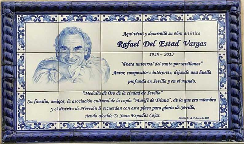 Uno de mis amables lectores ha tenido la gentileza de remitirme esta foto, por lo que implementamos nuestra colección de azulejos con este que es moderno tan solo del año pasado, dedicado al compositor y cantante Rafael del Estad que esta situado en la calle Marques de Pickman de Sevilla .-