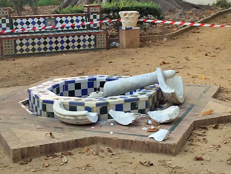 Cuando me venía de vuelta de hacer estas triste fotos pensaba , por lo menos han destrozado una fuente, podría ser peor, podrían haber destrozado a una persona con total impunidad , con total falta de vigilancia sobre la zona como ya ocurrió en su día cerca de este lugar EL CRIMEN DE LA MOVIDA .- En Sevilla al día de hoy los parque publicos son peligrosos, los frecuentan este tipo de alimañas, y aunque me repita no hay control ni vigilancia alguna, pues esto ha nadie le importa, ni le preocupa, ni da votos, (solo nos acordamos de ellos, cuando ruedan alguna pelicula o serie como Juego de Tronos, de los que estos jardines fueron escenarios ) . No se confien, lleve cuidado .- |